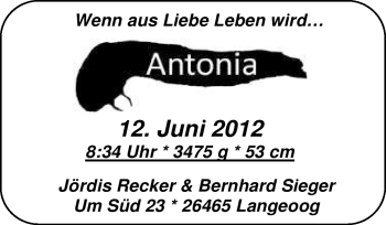 unsere herzlichen Glückwünsche zur Geburt Ihrer Tochter und Enkelin Antonia. Wir haben die Anzeige in der Nordwest-Zeitung gerade erst gefunden. Wir waren im Mai in der Schmuggelkiste und hatten ein sehr nettes Gespräch mit Herrn Recker (Opa), Frau J. Recker (Mama) und Herrn Sieger (Papa). Wir haben eine Kugeluhr und Schiffslampe gekauft. Wir freuen uns sehr und wünschen für die kleine Antonia, die Mama und die ganze Familie alles Gute und viel Liebe.
