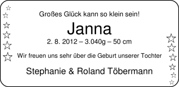 02.09.2012 um 21:27 Uhr von Erika und GeorgTöbermannHerzlich willkommen kleines Wunder! Unserer kleinen Janna, unserem ersten Enkelkind, sowie auch den Eltern, wünschen wir alles Gute.